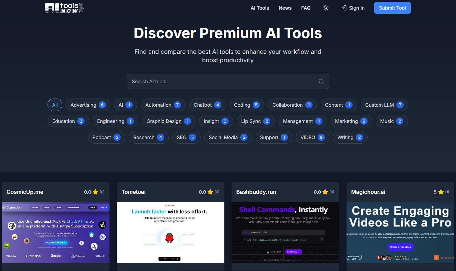 A comprehensive directory and comparison platform for AI tools and services. Features real-time search, advanced filtering, and detailed tool comparisons to help users find the perfect AI solution.